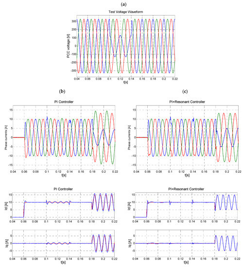 Simulation results of the current controller operating under unbalanced voltage conditions: (a) test voltage waveform, (b) PI controller and (c) proposed PI and resonant controller.