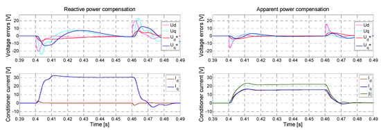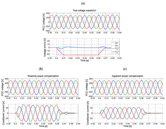 Figure 8 compares voltage-control strategies. A test voltage waveform includes a 10% symmetrical voltage dip between 0.4 and 0.48 s (Figure 8a). Figure 8b illustrates voltage control with a classical reactive power compensator, and Figure 8c illustrates the proposed method, which calculates active and reactive power components according to complex values of short-circuit impedance. In both cases, the presented control algorithm assures high dynamics, eliminating voltage errors during one cycle. The proposed apparent power-compensation strategy presents some advantages over the reactive power strategy. Firstly, the amplitude of the conditioner current is reduced. In such a case, the conditioner rating could be reduced, and the loading of the feeder related to voltage control is lower. Secondly, in the apparent power strategy, the conditioner action does not introduce phase distortion. In the reactive power strategy, a high variation in uq is observed, which is minimized by the PLL algorithm.