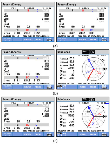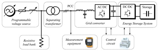 The power-conditioning functions of the designed system are verified experimentally. The scheme of the test setup is shown in Figure 9. The compensator is composed of a three-leg, three-level 15 kVA DC–AC grid converter and energy storage system. To provide dynamic voltage support, a power-source-type storage should be considered. In the experiment, this is a 75 V 94 F supercapacitor bank. Due to the high voltage ratio, it is interfaced to the DC-link by a dual active bridge (DAB) bi-directional DC–DC converter. The converter controls are implemented using C++ code in a dSPACE 1006 controller. The grid is simulated by a programmable voltage source with a programmable impedance module. A local resistive load bank is connected to avoid reverse power flow. A Fluke 434 power analyzer assures the measurement of the PCC voltage parameters according to the EN50160 standard. The experiments are conducted with 3 × 120 V nominal phase voltage (208 V line-to-line voltage). The fundamental value of the grid impedance in the experiment is: X = 0.4 Ω, R = 0.7 Ω and |Z| = 0.8 Ω.