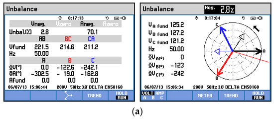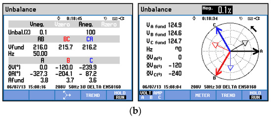 Three-phase voltage unbalance: (a) without compensation and (b) with compensation.