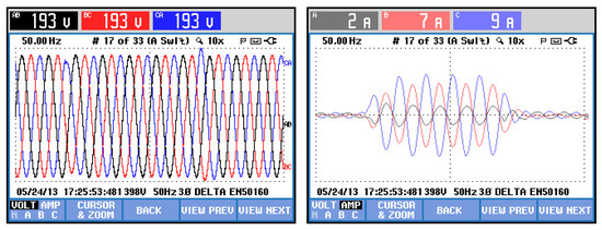 In Figure 11, the steady-state performance of the voltage balancing is presented. To balance the voltages, the conditioner injects a negative sequence current with active and reactive components set according to the grid complex impedance. The voltage drop on the grid impedance results in voltage balancing at the PCC. As seen in the graphs, the voltage unbalance can be eliminated. The integral path of the voltage controllers eliminates the steady-state error.