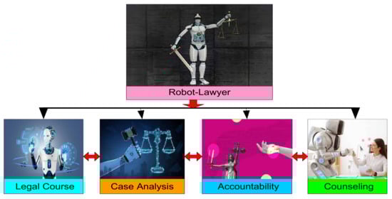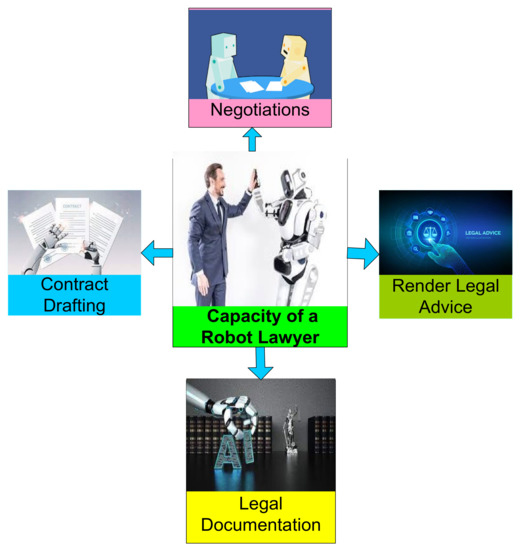 In Figure 3, the authors exemplify how a robot lawyer will perform in the technological ecosystem and the roles discharged. The legal profession encompasses a plethora of plausible legal routes flowing out from a legal cause: nature of argumentations, counselling clients, legal documentation, etc., all of which can be bettered and smoothly transacted with the application of AI to reach automated document drafting [38,39]. This will escalate the speed at which the wheels of justice move. Therefore, the present demands require a dedicated strategy wherein the cleavage between the ever-growing technologies and the commensurate legal reinforcement can be narrowed down. It forms a template to bridge the gap between law and robotics [40]. The proposition of increasing AI’s role in legal discipline cannot be disregarded because the legal profession is burdened under the enormous weight of a voluminous paper trail. With increasing AI intervention, the legal profession will undergo a complete revamp giving way to speedy justice and sharpened legal advice. The onset of AI-driven lawyers is imminent [41].
