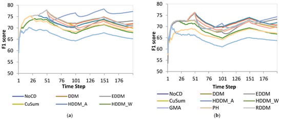 The overall performance of the base classifier on each data stream is presented in Figure 11a–f. It can be observed that the performance of the base classifier is decreased at the time of drift occurrence. Another point to observe here is that class imbalance has further affected the performance of most drift detection methods. Table 5 shows the performance in terms of the overall F1 score on each data stream. The bold values represent the best performances on a particular data stream. The results show that none of these methods has shown consistent performance on all data stream types.