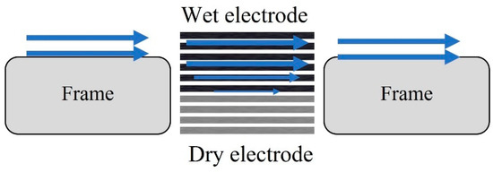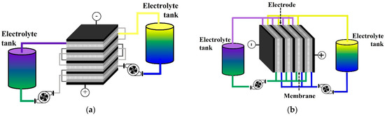 In terms of cell design, two flow patterns—horizontal and vertical—of electrolyte fed into a VRFB stack are briefly described for a basic understanding. Single cells of VRFBs are connected electrically in a series, and electrolytes are injected into the stack in a parallel direction to a stack structure (Figure 1a). This horizontal pattern establishes a parallel flow pattern leading to electrical shunt current that causes corrosion problems, loss of energy efficiency, and nonuniform distribution of current to the cell [30,31]. The vertical pattern (Figure 1b) occurs when single cells are assembled in a series and the electrolytes are vertically fed into the stack. This stacking feature was designed to prevent electrolyte block, resulting in a current bypass, and to protect water electrolysis. Furthermore, the demand for pump power is lower than parallel feeding.