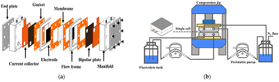 A VRFB single cell was created to prepare vanadium electrolytes and to investigate battery flow performance. The cell design included two half-cells separated by an ion-exchange membrane. The cell was constructed by a set of components distributed in sandwich layers, consisting of the inclusion of bipolar plates, joints, and carbon paper electrodes, as illustrated in Figure 2. This VRFB cell structure was composed of inlet and outlet channels (Teflon manifold) for the electrolyte and a flow distribution gate, and the vanadium electrolyte was fed by peristaltic pumps. The electrolyte flowed through the manifold, going into the single cells separately. The graphite bipolar plates contributed to the uniform transport of electrolytes and to electron conduction. Teflon flow frames were applied to increase homogenously the electrolyte flow to the electrode. Three-layer carbon paper electrodes (Sigracet SGL 25AA) are active sites where redox reactions occur. The membrane (Nafion Store, Ion Power) was used to separate the anode and cathode and to transfer protons. The sealing structure of VRFB was utilized to prevent internal and external leakages in the cell. In this work, fluorine–rubber gaskets with the proper features were designed for preventing leakages. The components of our VRFB cell were assembled in the structure under compressive pressure in the following sequence: end plate, manifold, current collector, bipolar plate, gasket, flow frame, electrode, gasket, and membrane. Both sides of the cell were assembled as a mirror sequence. After the system was installed as in Figure 2, the leakage test of the cell was conducted. The specifications of the VRFB used in this work are presented in Table 1.