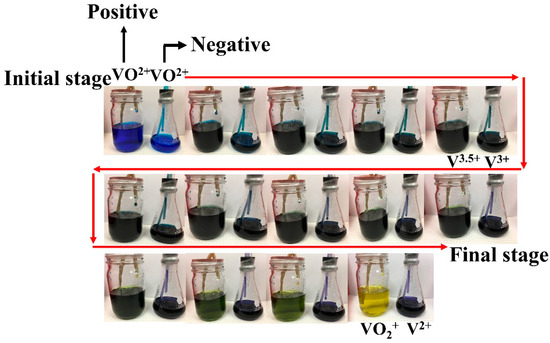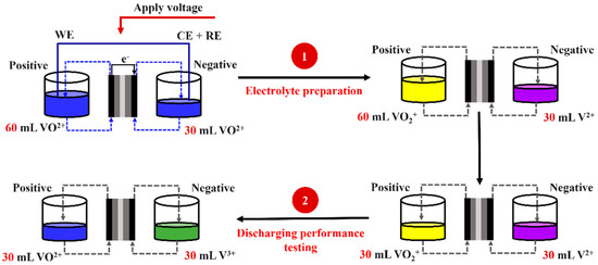 In this study, electrolytic dissolution was used to begin the electrolyte production process utilizing VO2+ as a source [35]. Since water is a naturally occurring solvent for electrolytes and is a highly polar solvent with the ability to dissolve ionic salts, using water as a solvent for electrolyte preparation is typically considered. That is due to meaningful differences in the electronegativity of hydrogen and oxygen atoms. Both cation and anion solutes excellently interact with water molecules, bringing about an extended solvation structure that theoretically corresponds to ion hydration [36]. Reactants for preparing electrolytes consist of active species and supporting electrolytes. Supporting electrolytes assist in increasing energy storage and ionic conductivity. As mentioned in the previous part, sulfuric acid has been extensively used as a supporting electrolyte to provide rational solubility (1.5–1.6 M). Note that VOSO4 is adopted as a starting reagent since it possesses higher solubility in an aqueous H2SO4 solution that is more than 10 times higher than that of V2O5 [37]. In our work, the electrolyte preparation was begun from VOSO4 in both half-cells, but the reservoir of the cathode side contained twice as much electrolyte solution as the reservoir of the anode side did. A logical prerequisite for imposing the electrolyte volume of the cathode and anode sides is the stoichiometry of the redox reaction occurring in a VRFB cell. One electron is lost during VO2+ transformations into VO2+ during oxidation, while two electrons are accepted during the reduction when VO2+ is transformed into V2+. That indicates that the VO2+:V2+ ratio is equivalent to 2:1, so in order to establish stoichiometry, the catholyte must be present in greater amounts than the anolyte [32,33]. A flow chart of the electrolyte preparation and discharging performance is shown in Figure 3. For experimental activities, the positive pole was connected as a working electrode, whereas the negative pole was linked with reference and counter electrodes. It should be emphasized that there is a narrowing of the operating temperature range (10 °C–40 °C). It undergoes thermal precipitation at temperatures above 40 °C and dissipation when below 10 °C [37]. Low temperatures are also related to the precipitation of species V2+, V3+, and VO2+ [38]. The electrical potential applied to the VRFB cell generated an oxidation reaction on the positive side and reduction on the negative side. When oxidation occurred, VO2+ was transformed into VO2+. This transformation can be observed by monitoring the electrolyte’s color change from blue to yellow, as presented in Figure 4. The vanadium metal is classified as a transition metal if the oxidation number changes, causing the color change (Equation (3)). In terms of the reaction, the reaction mechanism involved two steps (Equation (4) and (5)) [6]. VO2+ turned to be V3+ in the first step, and then a blue solution became green. In the second step, V3+ accepted the electron, and then V2+ was produced. The color of the electrolyte changed from green to purple, as indicated in Figure 3. Electrolytes were stored in an external reservoir [39] and were injected into the VRFB with the same flow rate. The redox reaction occurred on the electrode surfaces, and once it was finished, the products there were moved to the electrolyte reservoir for storage. According to this procedure, the migration and concentration change of positive and negative electrolytes were unaffected by the difference in electrolyte volumes.