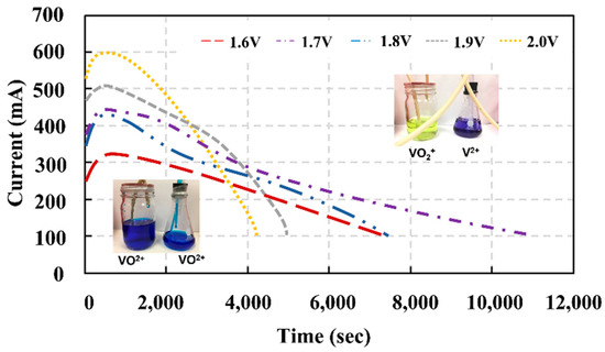 The actual operating voltage is a critical factor when charging VRFB or preparing electrolytes because the proper operating voltage (applied voltage) can drive an efficient electrolytic reaction with no side reactions. Because the amount of overpotential is required in addition to the thermodynamic voltage, the charging voltage must be greater than 1.26 V. The charging voltage affects the overall kinetics of the electrochemical reaction caused by charge transfer. If the VRFB is overcharged, hydrogen and oxygen gas may be produced at the negative and positive electrodes. Graphite plates can also be corroded, resulting in the production of carbon dioxide gas [6]. As a result, in this experimental section, the optimal charging voltage was investigated. Figure 5 illustrates the current profiles of the VRFB that were measured as a function of time during the electrolyte preparation process. The VRFB was electrically supplied via chronoamperometry by imposing a certain electrical potential (1.6–2.0 V). The system current measured during the preparation step, the reaction duration, the moles of electrons involved, and the electric charge involved in the redox reaction are the values that were observed to determine the appropriate voltage that was applied to initiate the reaction. When the electrolyte is introduced into the VRFB cell, a concentration gradient will cause the diffusion process to occur from a high concentration to a low concentration. Following that, a redox reaction takes place on the electrode surface, resulting in an electron transfer. The two main factors affecting electron mobility are surface morphology and electrode structure. Electrons technically move to an external circuit or adjacent electrodes via the electron migration process [40].