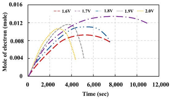 The electrical potential was applied to the vanadium electrolyte fed into the VRFB cell, and then the potential energy was transformed to kinetic energy or driving force of electron transfer from the cathode side to the anode side. The higher resulting current monitored during the process indicated higher reaction efficiency. In the next stage, the system current significantly decreased, since the VO2+ quantity was significantly reduced after the redox reaction was undergone. The reduction of reactant concentration powerfully affected the productivity of the redox reaction. Figure 6 depicts two criteria for imposing the appropriate potential for electrolyte preparation. The highest current observed during the process is the first criterion. The second pertains to a reaction period calculated from the time the current was reduced to 100 mA. After 100 mA, the current will reach an equilibrium state, implying that the concentration of ion products cannot be increased further. This decrease in current is consistent with the theory in terms of reactant concentration reduction when the redox was carried out for a certain period. Although the cell did not generate the highest current during the redox, applying an electrical potential to the VRFB at 1.7 V provided the most complete reaction possible. According to this scenario, the rate of the current drop is minimal. The moles of electrons determined during redox generated by various applied voltages are shown in Figure 5. Because the high quantity of electron moles in the electrolytes substantiates the reaction efficiency, it was discovered that applying 1.7 V provided the highest electron moles existing in the system [41].