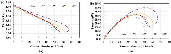 (a) Polarization curves and (b) power vs. current density plots obtained from the discharging process following electrolyte preparation with various applied voltages.