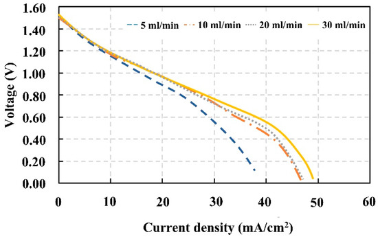 Polarization curves obtained from the discharging process after electrolyte preparation with different electrolyte flow rates.
