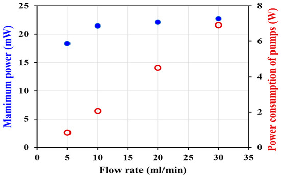 Even the VRFB cell with a flow rate of 30 mL/min of electrolyte showed the best performance, with a maximum power and voltage efficiency slightly higher than the values of the cells, with flow rates of 10 and 20 mL/min. Considering the power consumption of two pumps, the two pumps used to feed the electrolytes into the VRFB cells consumed 6.91 W for a flow rate of 30 mL/min (Figure 9). That was 3.35 times the power consumed by the pumps to provide a flow rate of 10 mL/min. This demonstrates that an excessive flow rate may reduce the energy efficiency of the VRFB system. Therefore, the optimal solution flow rate for discharging was 10 mL/min.