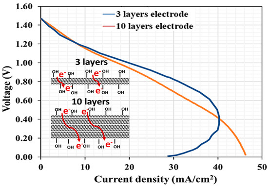 Polarization curves obtained from the discharging processes with three-layer and ten-layer electrodes.