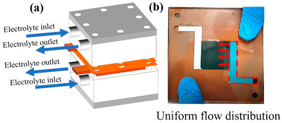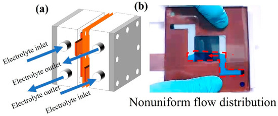 In the case of vertical feeding, the electrolyte diffused across electrode layers from one side to the other in a short period of time (Figure 13). The electrolyte was unable to move through all areas of the electrode, as can be seen. Shunt current is the name given to this flow pattern [31]. As a result, the horizontal flow pattern provided a greater retention time, resulting in improved electrochemical reaction performance. Another strategy for improving electrolyte flowability and diffusibility was to create cone flow channels on the flow frame.