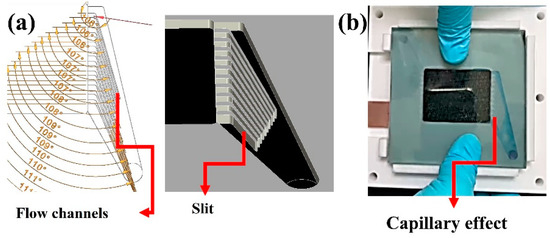 However, this flow channel is too small, resulting in a capillary effect and high flow resistance (Equation (9)) [56]. The capillary effect can cause air to be trapped, resulting in an unstable flow (Figure 14).