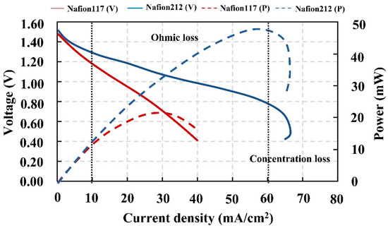 Figure 15 shows that the VRFB containing Nafion 212 performed better than the cell containing Nafion 117. It produced open-circuit voltages of 1.51 V, a power of 47.33 mW, a maximum current density of 66.95 mA/cm2, and maximum energy of 0.13 Wh. The VRFB assembled with Nafion 117, on the other hand, provided 1.48 V open-circuit voltage, 21.81 mW power, 46.26 mA/cm2 maximum current density, and 0.04 Wh maximum energy. In terms of voltage loss at medium current density, the VRFB with Nafion 212 had a significantly lower ohmic loss than the VRFB with Nafion 117 [65]; thus, the material resistance was reduced. The lower resistance had a positive effect on proton transfer through the membrane that enhanced the redox kinetics [66]. As a result, it can be interpreted that the proton transfer through the membrane via vehicle and Grotthus mechanisms strongly influences on VRFB performance in comparison with the surface mechanism. As a result, this could be observed from Nafion 212, which contained a smaller number of sulfonate groups than Nafion 117; therefore, the proton transfer ability via the surface mechanism should be lower than that when Nafion 117 is used. The results can confirm that the bulk mechanism had a greater effect than the surface mechanism, and the proton transfer was coupled with the water movement via electro-osmotic drag [23]. In actuality, the performance of the cell containing Nafion 212 as shown in the polarization curves was inferior to that of the cell containing Nafion 117. When it comes to membrane thickness, Nafion 212 is less thick than Nafion 117, and it performs better than Nafion 117. This indicates that a smaller membrane thickness improves proton transfer capabilities through the Grotthus and vehicle processes [67,68]. Furthermore, the transfer resistance will decrease as the membrane thickness decreases, according to Ohm’s law. Thinner membranes aid in improving proton conductivity and proton permeability. In terms of mechanical properties, Nafion 212 has a lower swelling ratio than Nafion 117 [67,68]. With this rational information, the thickness of the membrane has a greater impact than the number of sulfonate groups; thus, Nafion 212 performed better than Nafion 117.