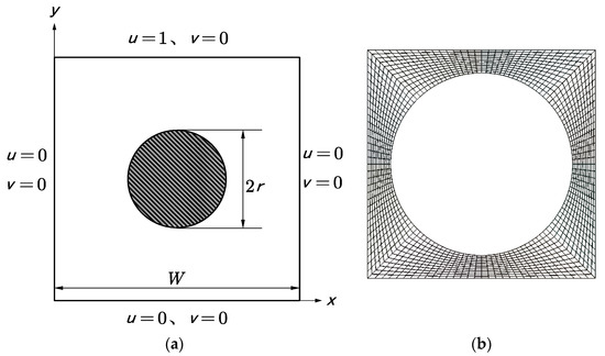 The lid-driven square cavity flow with an embedded circular obstacle. (a) Model (b) Meshes.