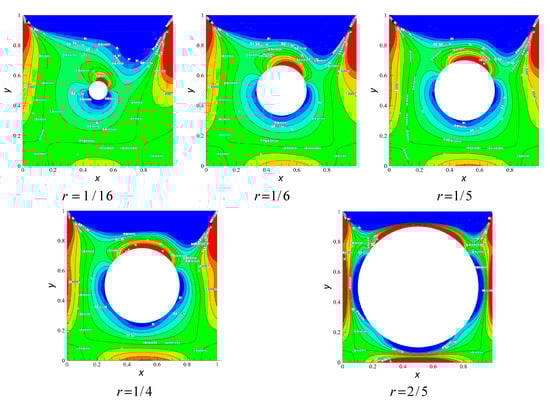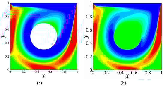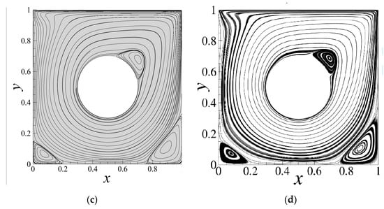 When the radius of the embedded circular obstacle becomes larger due to the strengthening of the wall effect, at , the upper primary vortex in the cavity transforms almost into two corner vortices, as shown in Figure 8. With the increase in Re, the two vortices on the upper region of the square cavity do not show the merger of the vortices as at instead, a small-scale vortex on the upper left side and a large-scale vortex on the upper right of the obstacle are formed by gradual contraction.
