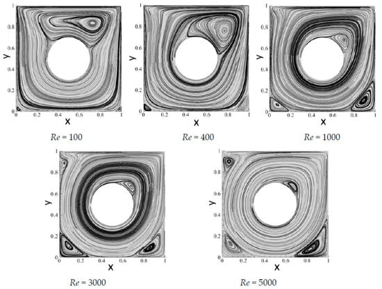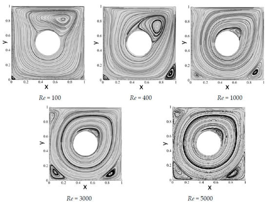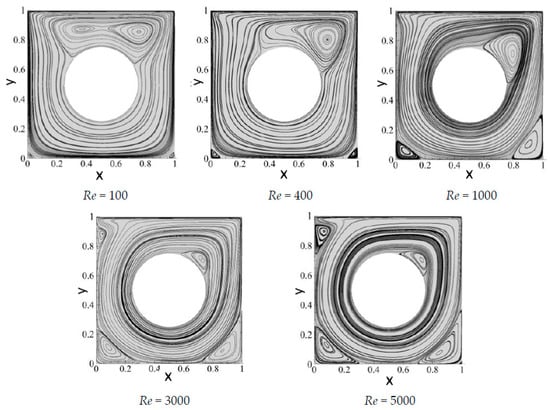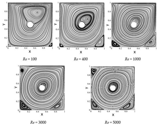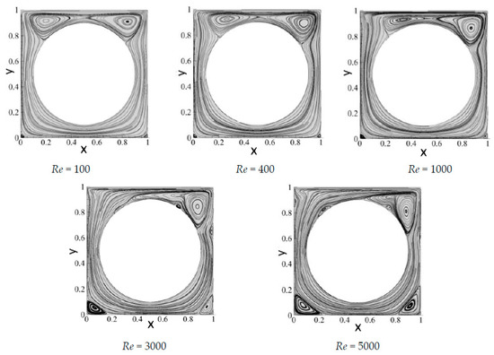 Figure 5 displays the variation of the flow in the lid-driven square cavity at different Reynolds numbers at the radius . As it can be seen in Figure 5, with the increase in Re, the corner vortex at the bottom gradually grows in size. The center of the vortex at the upper right position of the cavity gradually approaches the boundary of the embedded obstacle and decreases. When Re is greater than 3000, an induced vortex appears on the upper left position of the cavity, and the induced vortex becomes larger with the increase in Re. However, in the results obtained by Huang et al. [13] using the lattice Boltzmann method, the corner vortex in the lower right corner of the square cavity is not observed at Re = 100. Owing to the higher-order properties of the method used here, the present spectral/hp element methods successfully capture the third vortex on the lower right corner of the cavity, and the vortex on the lower right corner is clearly visible.