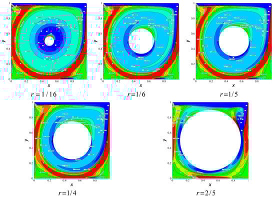 Figure 6 shows the streamlines in the lid-driven square cavity at different Reynolds numbers Re at the radius . At this radius, the characteristics of the flow in the square cavity at various Reynolds numbers are essentially the same as at the radius . With the increase in Re, the corner vortex at the two sides of bottom gradually expand, but the vortex in the upper right corner of the square cavity gradually becomes smaller. Compared to the streamlines at , the primary vortex at the upper position of the embedded obstacle in the cavity tends to elongate to some extent in the case of Re = 100.