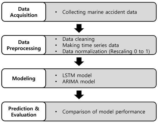 In this section, we presented the workflow for our approach to predicting the frequency of marine accidents based on LSTM models. Figure 1 illustrates the entire process of this study, including data acquisition, data preprocessing, the development of a prediction model using LSTM and ARIMA, and the evaluation of the model based on the results of the prediction.