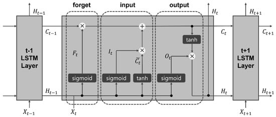 LSTM models were implemented using Keras libraries in Python, and Tensorflow as the backend in the Spyder tool for Python. We initialized weights and biases for each layer using random values. The LSTM consists of forget gate (), input gate (), cell state (), and output gate (), which stores information in memory cells and transfers it to the next stage. The forget gate determines how much past information will be forgotten, and it is the process of applying the sigmoid function after multiplying the current data and the hidden layer values of the past by each weight. The input gate controls new information in the cell based on how important the information is. The cell state forgets the past information as calculated by the forget gate and calculates the current memory cell value by multiplying the current information value by the importance of the input gate. Finally, the output gate determines how the information in the cell will be used in the output cell. Each cell contains weights that are used to control each gate. Optimization of the weights is performed by a training algorithm based on an error resulting from network output [24,25]. The mathematical expression of the forget gate (), input gate (), cell state (), and output gate () are defined in Equations (1)–(4) [23]: