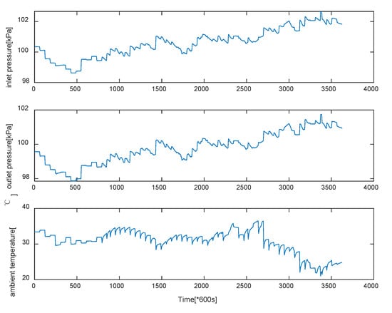 The performance degradation test rig of the compressed air supply unit was mainly composed of a compressed air supply unit (CASU); a total air cylinder; collection equipment; air pressure, temperature, flow rate, and other sensor sets; a temperature box, etc. In order to realistically simulate the stress of the working environment, the inlet air temperature of the CASU was set to the actual ambient temperature, the inlet air pressure was the atmospheric pressure in the actual environment, the load was the same volume of the total air cylinder as what is used on the vehicle, and the total air pressure was controlled at around 900 kPa. By supplying three-phase AC 380 V voltage to the CASU, the CASU was driven to work continuously with load. During the test, the input and output signals of the intake filter as well as the ambient temperature were collected in real time by the sensor sets, as shown in Figure 5. The sampling interval for the performance degradation test of the CASU was set as 600 s, and the sampling frequency was 1 Hz.