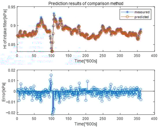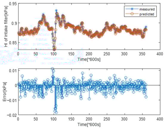 As can be seen in Figure 7, the predicted values of the HI of the intake filter based on the LSTM network could follow the measured values very well, and the error between the predicted and measured values was very small, with a maximum error of less than 0.02 kPa, which proved that the performance degradation prognosis method based on the LSTM network had good prediction accuracy.