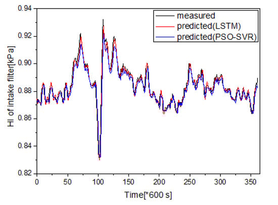 To further validate the effectiveness and accuracy of the LSTM network-based performance degradation prognosis method for components of brake systems, a prediction model based on the PSO-SVR method was used to compare the prediction results of the HI of the intake filter.