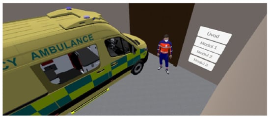 The garage for the ambulance was chosen as the basic scene (see Figure 2). The individual module buttons are positioned in a corner on the wall to make them easily visible and clear. The simulation is controlled using standard controllers. The term “button” refers to the button on the corresponding controller that the paramedic presses. On the right side there is an avatar that gives information about the selected module. This type was chosen as a neutral ground for paramedics, where they have enough peace of mind to orient themselves in the environment and fully focus on virtual reality training. The option to select a module is shown in Figure 3.