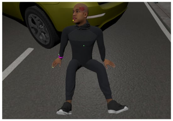 The prepared module focuses on a car accident scenario. The scene is set in the suburbs in the evening. The layout of the accident and the injured people is such that a maximum space of 3 × 3 m is needed. The evening hours were chosen to simulate degraded visibility conditions and thus create a more challenging decision-making situation. The module is designed for a two-car accident at a given time (see Figure 6). The scene itself is supplemented with sounds such as screams and cries of the injured, as well as ambulance and engine sounds. The aim is to create as synergistic an experience as possible, so that users can experience complex situations and practise their knowledge of how to handle them using this technology.