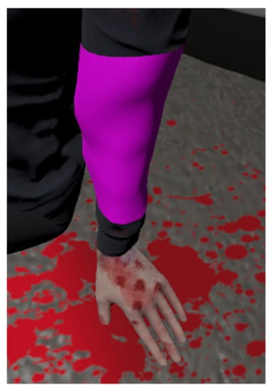 When triaging according to the START method, the user controls the basic functions by which the patient is sorted into one of four basic colours. These functions include heart rate, respiration, and capillary test. In terms of real testing, haptics and touch with the patient are important for these measurements, so smartwatches were used for virtual training to represent the measurement of these functions and give the values. The display of this value has a lifetime (it is displayed for a given amount of time) because of the more realistic simulation of the real process where rescuers must calculate and remember it. This watch indicates by familiar pictures what type of measurement it is. The capillary measurement is simulated using an image that shows a detail of the nail (this principle was used because it is a very detailed measurement that would be simulated on the injured person poorly in terms of virtual reality capabilities). Measurements are taken by holding the hand at selected points for the time shown on the watch (see Figure 7). The JUMP-START method is used to treat children and teenagers to ensure that the paramedic attends to them among the first injured. To perform the application, this means that it is monitored whether children have been treated urgently.