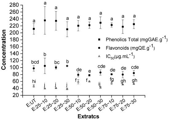 Analysis of the total content of phenolic compounds, flavonoids and the antioxidant activity (IC50) of red propolis extracts obtained in different conditions. Values presenting the same letter in the same analysis do not show significant differences (p > 0.05) in Tukey’s test at 95% confidence. Samples E:UT and E:25−30 presented values lower than the quantification limit for kaempferol. Average of analyses obtained from triplicates (n = 3).