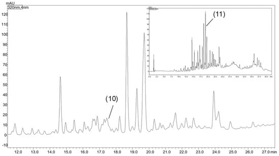 Chromatographic profile of the red propolis extract, kaempferol (10) and formononetin (11) (sample E:50−20).