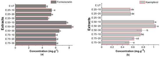 Concerning the identification and quantification of the chemical species of interest in the samples (red propolis extracts) (Table 2), only formononetin was identified in all the obtained extracts, and kaempferol was found and quantified in eight of the ten samples studied here. It was not possible to quantify the kaempferol in the control sample (E:UT) and in the E:25−30 sample given that this compound was present at a concentration below the quantification limit (result confirmed by repeating the analysis in triplicate). The values of these two components (formononetin and kaempferol) in the obtained extracts are shown in Figure 3. Therefore, formononetin was the most abundant chemical species found in the extracts, and its profile was confirmed by the HPLC method [84,85].