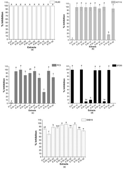 The percentage of inhibition varied according to the tumor lineage and the extract analyzed, where for the HCT-116 line the range was between 1.73 and 100% for samples E:UT and E:50−20, respectively; for the PC3 line the range found was from 2.16 to 100.00% for samples E:UT and E:25−20, respectively; for the SF295 line the range was from 5.21 to 100.00%, for samples E:25−30 and E:25−20, respectively; and from 67.89 to 97.52%, samples E:25−10 and E:25−20, respectively, for line SNB19, with significant differences among samples (p > 0.05). For the HL-60 line, regardless of the conditions, all the extracts presented a percent inhibition that was higher than 99%, without showing significant differences between the analyzed samples (p < 0.05) (Figure 4a–e).