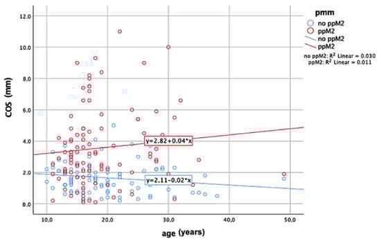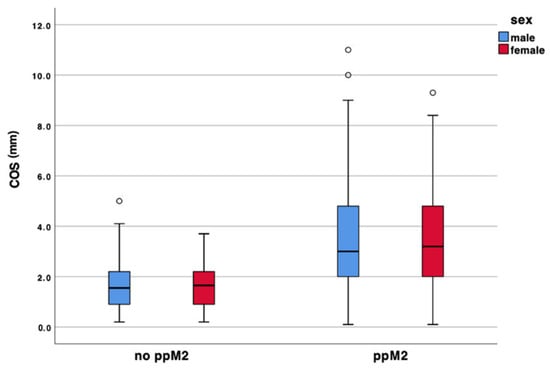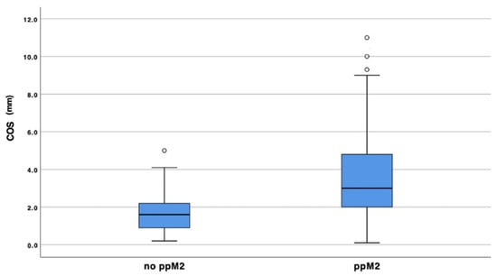 Patients with a ppM2 showed a statistically significant deeper COS (p < 0.01; 3.57 mm) in contrast to the control group (Figure 2 and Table 2).