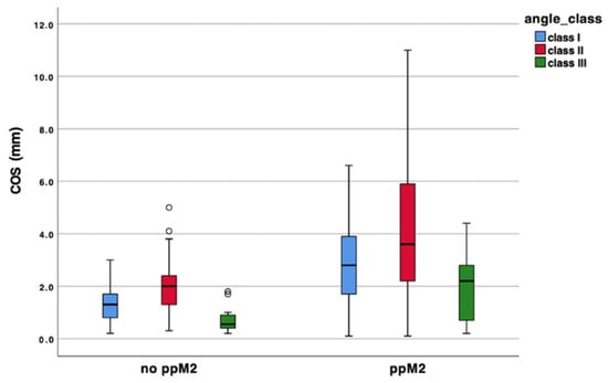 Figure 5 shows the COS depth separately for each angle-class (class I, class II, class III). As it can clearly be seen, COS is deeper in the experimental group regardless of the malocclusion. However, analysis of variance showed that there was no statistical significance (p = 0.29) between COS, a ppM2, and angle-class (Table 5).