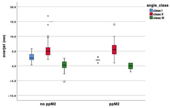 There was no statistically significant dependency (p = 0.17) between a ppM2, angle-class, and OJ (Figure 6 and Table 6).