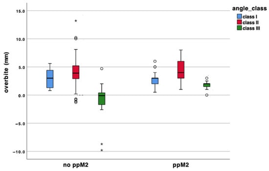 Table 7 displays means and SDs, median and IQR of OB measurements for each angle-class. OB values showed a positive correlation with class II in the experimental and in the control group (4 mm and 4.05 mm). General low values for OB can be observed for angle-class III (1.97 mm and −1.18 mm). the conjunction between OB and angle-class III was calculated as highly significant (p < 0.01).
