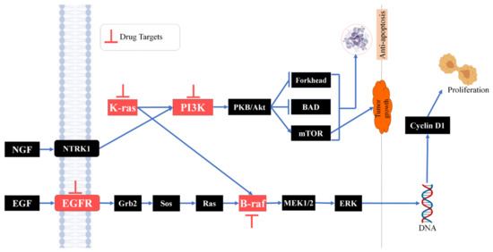 There are wide varieties of stimuli that could cause a normal cell to transform into a malignant one. When a cell’s apoptosis process is blocked for some mechanism, the cell becomes immortal and may convert into a cancerous one. Apoptosis is an essential feature of normal cells by which aged and damaged cells proceed toward self-degradation [61]. Antiapoptotic activity in NSCLC is mediated by PI3K [62] and K-Ras [63]. In addition to its role in cell proliferation, K-Ras dysfunction is thought to contribute to the development of nearly 15% to 20% of cases of non-small cell lung cancer [64]. The growth factors B-Raf and EGFR are also to blame [64]. Blocking any of the aforementioned targets can result in the remission of NSCLC as some of the previous studies have validated [65,66,67,68,69,70].