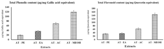 Our findings indicate that in the methanolic extract of the plant Allium tubersosum, TPC and TFC present highest compared to other extracts. TPC for the methanolic extract is 119 g GAE/mg extract, while TFC is 146 g quercetin/mg extract (Figure 2). To determine TPC, we used the following equation for the gallic acid standard curve: , and for quercetin, we used the following equation: .