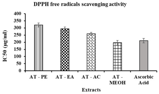 The antioxidant activity of the plant extracts was performed using the DPPH free radicals scavenging activity following the method described by Kumarasamy et al. [32]. First, by the serial dilution process, 5 different concentrations of the sample were prepared from 1 mg/mL of stock solution using methanol. The diluted solution and DPPH (80 µg/mL in methanol) solution were mixed 2 mL each and kept in the dark for 30 min. Absorbance was measured at 517 nm. The control was DPPH mixed with methanol instead of extracts. Ascorbic acid was treated as standard. A concentration–response curve was used to determine the value for each extract. Percent invitations were determined using the formula: