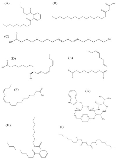 Structure of (A) 1,2-benzene dicarboxylic acid, butyl octyl ester; (B) 3-ketostearic acid; (C) (8S)-hydroxyoctadeca-9,12-dienoic acid; (D) 9-hydroperoxy-10,12,15-octadecatrienoic acid; (E) 9-hydroxy-9,11,15-octadecatrienoic acid; (F) a-linolenic acid; (G) americine; (H) di-n-octyl phthalate; (I) fumaric acid, di(2-decyl)ester.