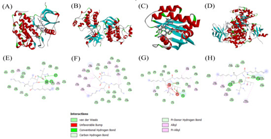 Docking pose of ligand americine with the target receptors: (A) EGFR, (B) B-Raf, (C) K-Ras, and (D) PI3K. 2D interaction of ligand americine with the target receptors: (E) EGFR, (F) B-Raf, (G) K-Ras, and (H) PI3K.