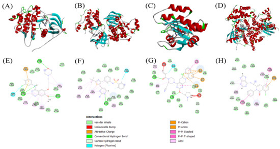 Docking pose of target proteins with their positive control: (A) EGFR with Gefitinib; (B) B-Raf with DaB-Rafenib; (C) K-Ras with Sotorasib; (D) PI3K with Duvelisib. 2D interaction of target proteins with their positive control: (E) EGFR with Gefitinib; (F) B-Raf with DaB-Rafenib; (G) K-Ras with Sotorasib; (H) PI3K with Duvelisib.