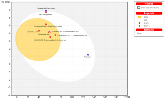 Nine compounds selected after molecular docking were considered for ADMET profiling by the SwissADME server. By the ADMET analysis, it was found that, except for americine and di-n-octyl phthalate, all the seven remaining compounds penetrate the blood–brain barrier, which is not good, as they may interact with the central nervous system. In addition, they are not effluated by the BBB’s P-glycoprotein pumping, as predicted by the BOILED-Egg Model (Figure 8), implying that it may have passed through the BBB. However, all the compounds follow the drug-likeness profile except di-n-octyl phthalate and fumaric acid, di(2-decyl)ester. All eight compounds have high gastrointestinal absorption capacity except fumaric acid, di(2-decyl)ester. Considering all the parameters of ADMET, it was found that only one compound, i.e., americine, shows drug-like activity and may be suitable for further validations. The pharmacokinetics and drug-likeness score of all the compounds is recorded in Table 4.