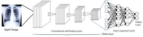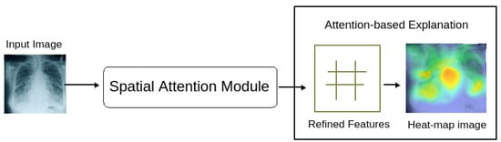 Attention has been used with Fully ConvNets (FCNs) in [,] to design a multi-attention convolutional neural network for automatic disease detection in chest X-ray images. Fully ConvNets are an adaptation of the DenseNet-121 model that can process spatial information []. FCNs create multiple attention maps for each pathology category being considered via a collection of correlated convolutions followed by a mean-pooling process. Because each channel in an image shows a specific visual symptom for a disease class, the channels have the ability to represent huge intra-class variability. This intra-class variability helps to generate explanations using heat maps based on spatial attention maps.