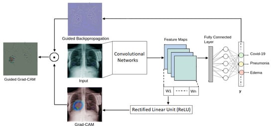 A system that integrates image processing, Guided Grad-CAM, ConvNets and risk management is presented in [] to detect COVID-19 in chest radiography images. Guided Grad-CAM combines Grad-CAM and guided backpropagation to create high resolution heat maps that visualize at the pixel level the most important areas of an X-ray image for a ConvNet (see Figure 3).