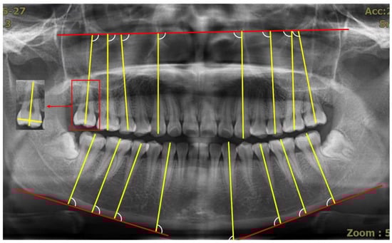 The maxillary reference line was drawn, connecting the lowest points of the orbital rims, and the mandibular reference lines were the tangent lines of the mandibular margin on both sides [17,19,20]. The root axes of these teeth were drawn connecting the midpoint of the mesiodistal diameter of the dental crown along the root canal path or root bifurcation (Figure 1).