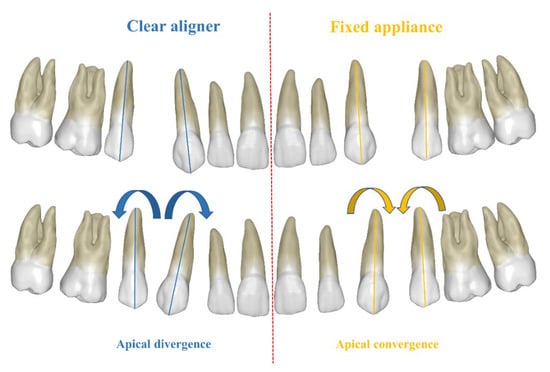 - For the categories of the nonparallel angulation of the root on both sides of the tooth extraction space after treatment, the clear aligner appliance mainly showed root apical divergence, while the fixed appliance mainly showed root apical convergence.